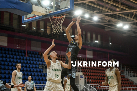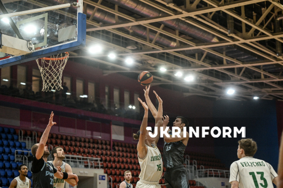 Гравці БК "Запоріжжя" В’ячеслав Кіктєв (праворуч) та БК "Київ-Баскет" Максим Сандул беруть участь у матчі чемпіонату України з баскетболу серед команд Суперліги, що завершився з рахунком 80:86 на користь гостей, на майданчику КСК "Шинник", Дніпро, 2 листопада 2025 року.