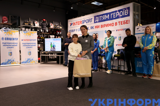 Майстер спорту України міжнародного класу з легкої атлетики зі штовхання ядра, учасниця ХХХІ літніх Олімпійських ігор 2016 року в Ріо-де-Жанейро Галина Облещук, легкоатлетка, майстер спорту України міжнародного класу з легкої атлетики, учасниця XXVIII та XXIX Олімпійських ігор Ірина Шепетюк, боксер, майстер спорту України міжнародного класу з легкої атлетики Антон Коссе, легкоатлетка, метальниця списа, володарка Кубку Європи 2003 року, учасниця літніх XXVII, XXVIII і XXIX Тетяна Ляхович, голова ГО "Родини загиблих захисників і захисниць Івано-Франківська", представниця Благодійного фонду “Діти Героїв” Галина Батюк, голова Івано-Франківського обласного відділення Національного олімпійського комітету України Мирослав Карабін, голова ГО “Позиція краю” Роман Хомен, майстер спорту України міжнародного класу з боксу, учасник літніх ХХVII Олімпійських ігор, президент Івано-Франківської міської федерації боксу Сервін Сулейманов і директор торгового центру “Епіцентр” у місті Івано-Франківськ Олександр Ужвенко (справа наліво) беруть участь у спортивному заході “Інтерспорт – дітям Героїв”, організованому у межах спільного проєкту компаній Intersport, Епіцентр та Національного олімпійського комітету України для дітей загиблих захисників України, Івано-Франківськ, 9 жовтня 2025 року.