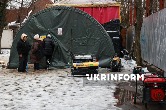 Генератор біля мобільного намету обігріву, розгорнутого рятувальниками через складну ситуацію з електро- та теплопостачанням, спричинену російськими атаками на енергооб’єкти України, Одеса, 20 лютого 2026 року.