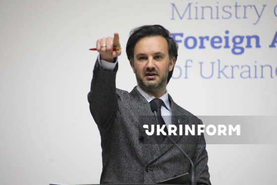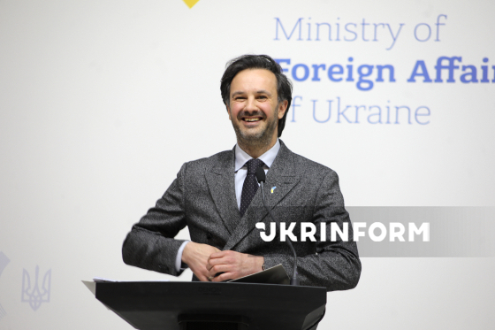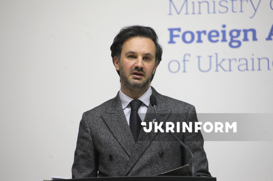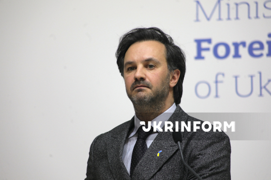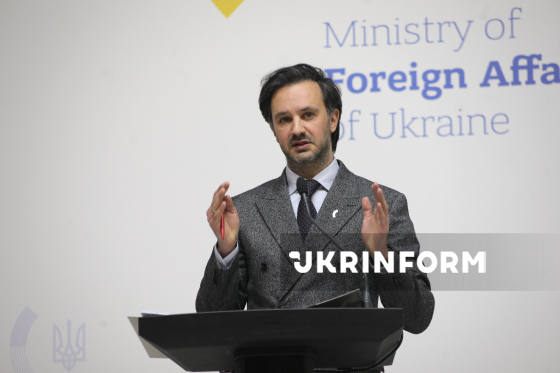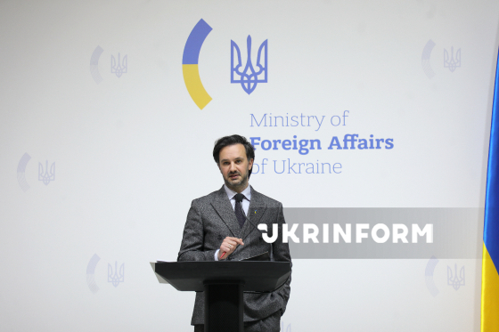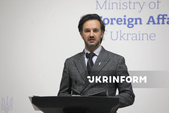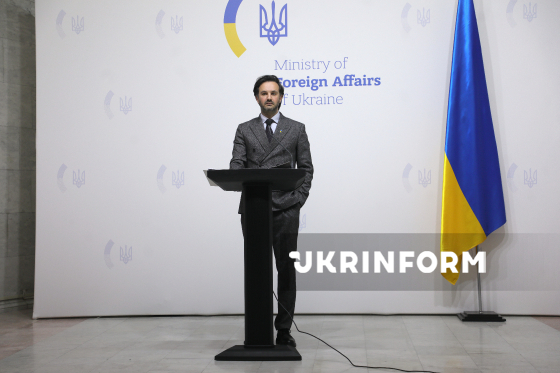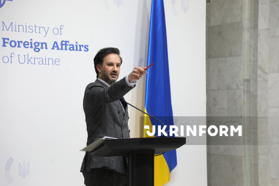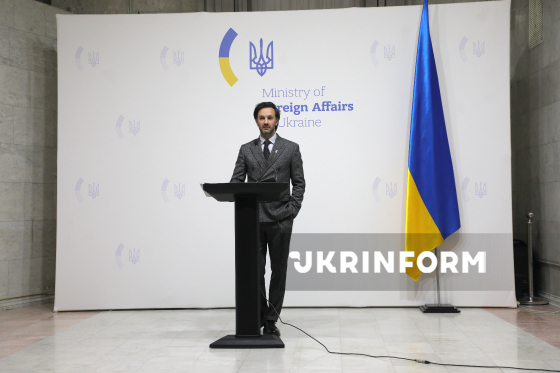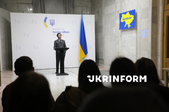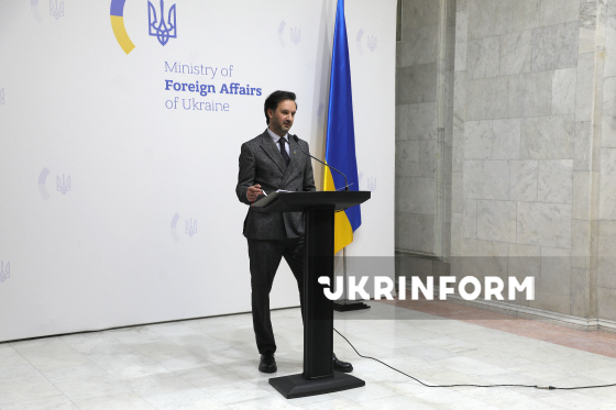 Речник Міністерства закордонних справ України (МЗС) Георгій Тихий виступає під час брифінгу щодо актуальних міжнародних питань, Київ, 18 березня 2026 року. На заході, зокрема, йшлося про ситуацію з можливим відновленням нафтопроводу "Дружба", посилення міжнародного тиску на Росію та загострення ситуації на Близькому Сході.