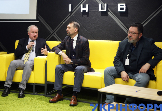 Уповноважений із захисту державної мови Тарас Кремінь, народний депутат України Микола Княжицький та дипломат, директор Київського безпекового форуму Данило Лубківський (справа наліво) під час форуму "Культнаступ", Київ, 9 вересня 2024 року.