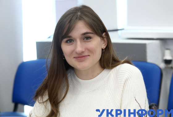 Блогерка, героїня інформаційної кампанії Даша Євтух під час експертного обговорення на тему: "Результати інформаційної кампанії "Стань на варті свого серця". Чи знають українці, як запобігти серцево-судинним захворюванням?" в Українському національному інформаційному агентстві "Укрінформ", Київ, 29 лютого 2024 року.