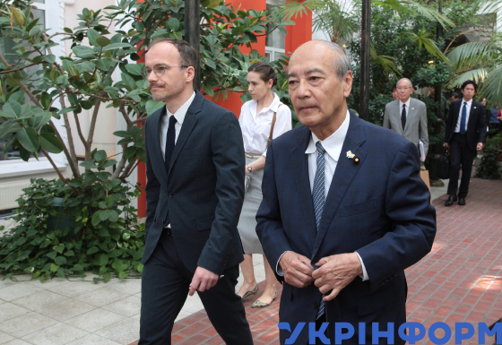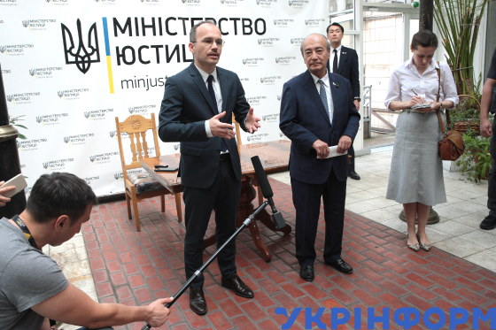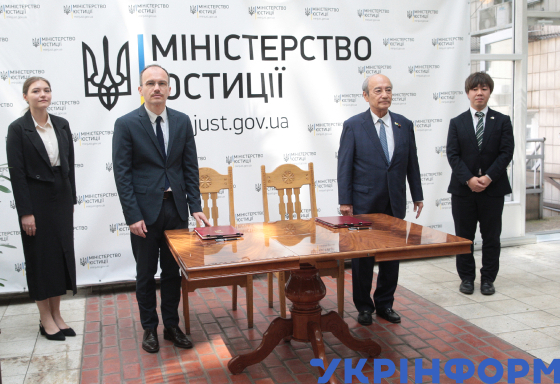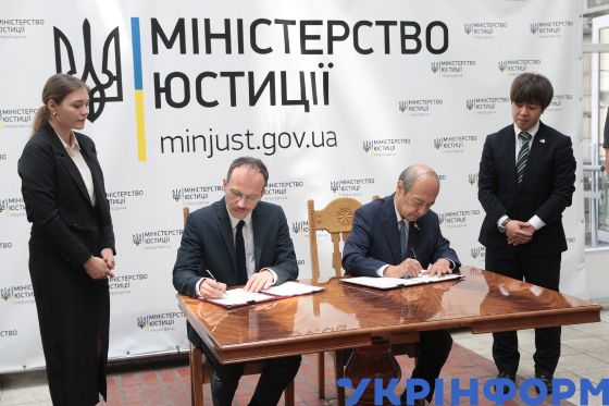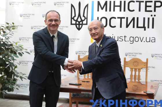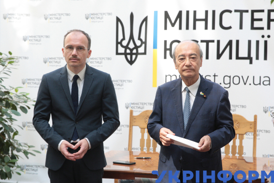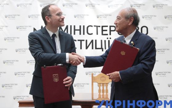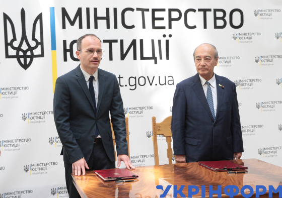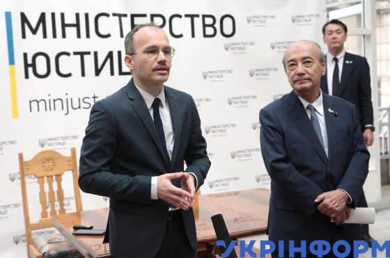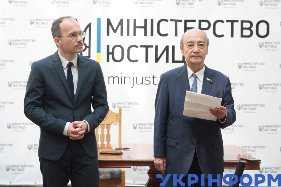 Міністр юстиції України Денис Малюська та міністр юстиції Японії Рюджі Коїдзумі перед підписанням меморандуму про співробітництво у сфері права та правосуддя, Київ, 5 серпня 2024 року.