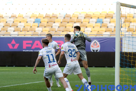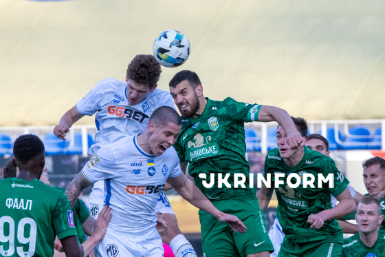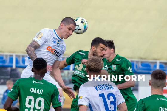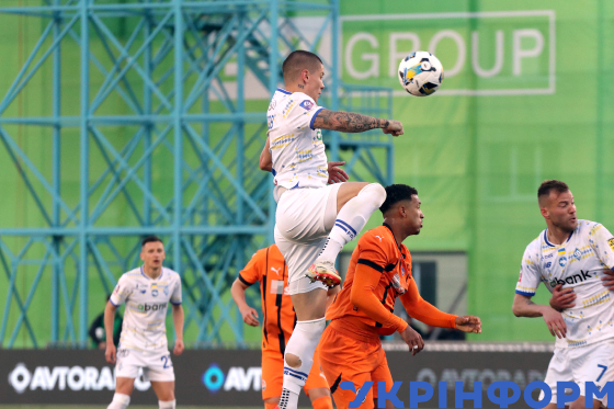 Захисник ФК “Динамо” Денис Попов (на першому плані) стрибає під час матчу 22-туру чемпіонату України з футболу серед команд Прем`єр-ліги між ФК “Динамо” (Київ) і ФК “Карпати” (Львів), що завершився з рахунком 0:1 на користь львів`ян, на стадіоні “Динамо” імені Валерія Лобановського, Київ, 4 квітня 2026 року.