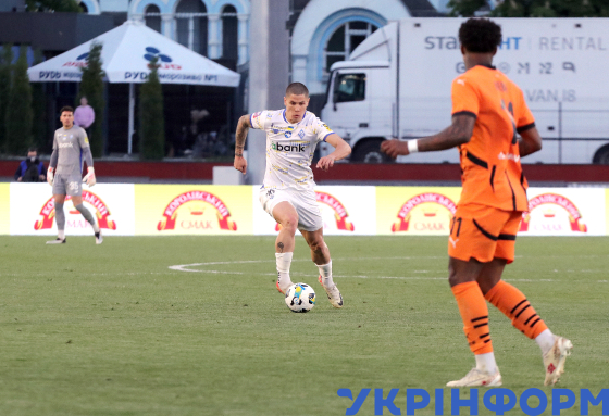 Захисник ФК “Динамо” Денис Попов під час фінального матчу Кубку України з футболу проти ФК “Динамо” на футбольному полі Центрального стадіону у Житомирі, 14 травня 2025 року.