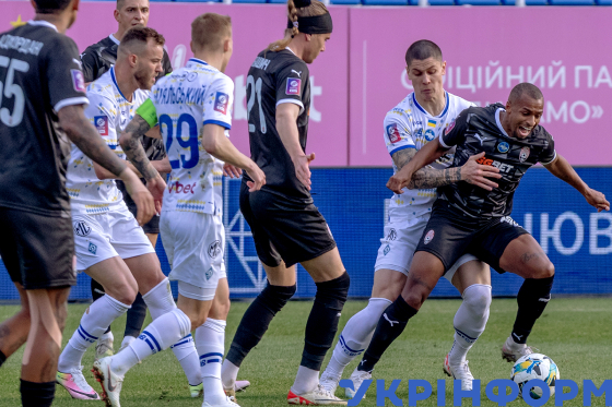 Захисник ФК “Динамо” Денис Попов (ліворуч) бере участь у матчі 22-туру чемпіонату України з футболу серед команд Прем`єр-ліги між ФК “Динамо” (Київ) і ФК “Карпати” (Львів), що завершився з рахунком 0:1 на користь львів`ян, на стадіоні “Динамо” імені Валерія Лобановського, Київ, 4 квітня 2026 року.