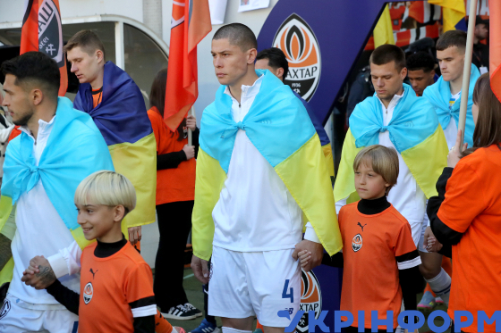 Гравець київського ФК "Динамо" Денис Попов (у центрі) перед початком матчу 26-го туру чемпіонату України сезону 2024/25 серед команд Прем’єр-ліги проти донецького ФК "Шахтар", що завершився нічиєю з рахунком 2:2, Львів, 27 квітня 2025 року.