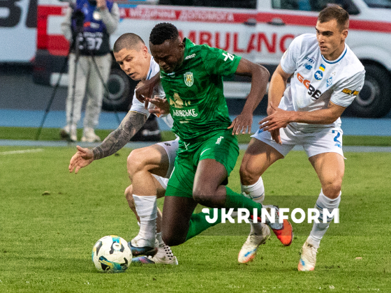 Захисник ФК “Динамо” Денис Попов, півзахисник ФК “Карпати” Пауло Вітор, захисник ФК “Динамо” Костянтин Вівчаренко (зліва направо) борються за м`яч під час матчу 22-туру чемпіонату України з футболу серед команд Прем`єр-ліги між ФК “Динамо” (Київ) і ФК “Карпати” (Львів), що завершився з рахунком 0:1 на користь львів`ян, на стадіоні “Динамо” імені Валерія Лобановського, Київ, 4 квітня 2026 року.
