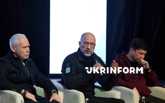 Голова Асоціації прифронтових міст та громад, Харківській міській голова Ігор Терехов, перший віцепрем’єр-міністр України - міністр енергетики України Денис Шмигаль і начальник Миколаївської обласної військової адміністрації Віталій Кім (зліва направо) беруть участь у панельній дискусії під час Форуму прифронтових міст та громад "Стійкість, відновлення, розвиток: візія прифронтових громад - 2026", Харків, 5 лютого 2026 року.