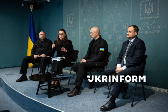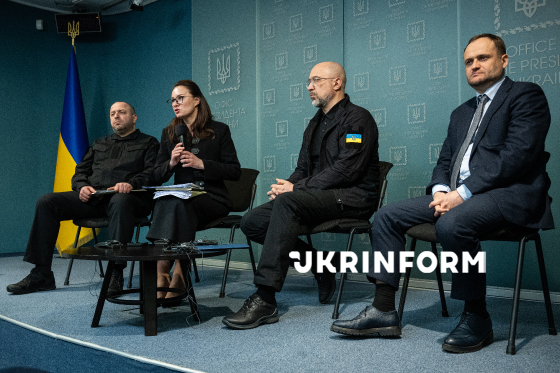Секретар Ради національної безпеки і оборони України Рустем Умєров, Прем`єр-міністр України Юлія Свириденко, міністр енергетики України Денис Шмигаль та віцепрем`єр-міністр з відновлення України – міністр розвитку громад та територій України Олексій Кулеба (зліва направо) беруть участь у пресконференції за підсумками засідання Ради національної безпеки і оборони України, під час якого затвердили плани стійкості для всіх областей та обласних міст, окрім Києва – столиці надали додатковий час на підготовку відповідних документів, Київ, 3 березня 2026 року.