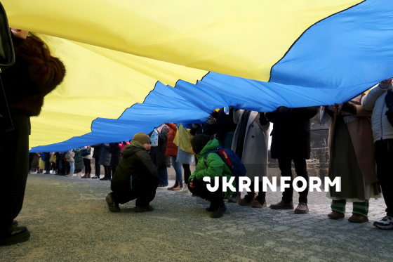 Діти співають під час щорічної символічної акції "Ланцюг єдності", приуроченої до Дня Соборності України, у межах якої близько сотні українців розгорнули 30-метровий синьо-жовтий прапор України на Карловому мосту, об’єднавши два береги Влтави, у Празі, Чехія, 24 січня 2026 року.