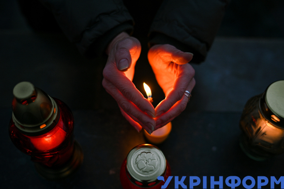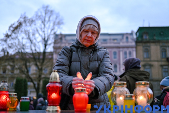 Жінка захищає руками свічку від вітру під час вшанування пам’яті жертв голодоморів в День пам’яті жертв голодоморів на площі біля пам’ятника Тарасу Шевченку, Львів, 25 листопада 2023 року.