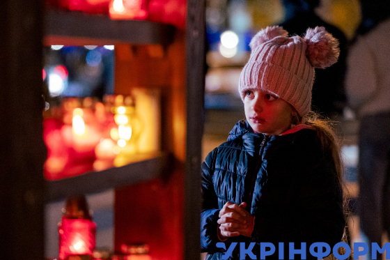 Дівчинка під час вшанування пам’яті жертв голодоморів в День пам’яті жертв голодоморів на площі біля пам’ятника Тарасу Шевченку, Львів, 25 листопада 2023 року.