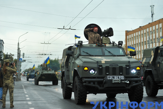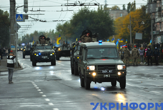 Колона військової техніки під час параду з нагоди Дня захисників і захисниць України та Дня українського козацтва на площі Перемоги, Сєвєродонецьк, Луганська область, 14 жовтня 2021 року.