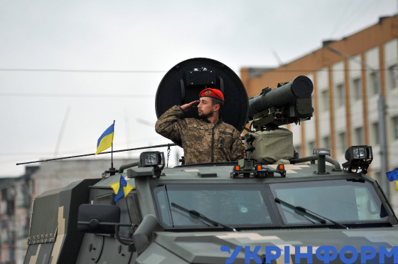 Військовослужбовець під час параду з нагоди Дня захисників і захисниць України та Дня українського козацтва на площі Перемоги, Сєвєродонецьк, Луганська область, 14 жовтня 2021 року.