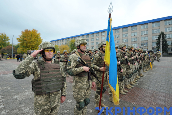 Військовослужбовці з прапором України під час військового параду з нагоди Дня захисників і захисниць України та Дня українського козацтва на площі Перемоги, Сєвєродонецьк, Луганська область, 14 жовтня 2021 року.