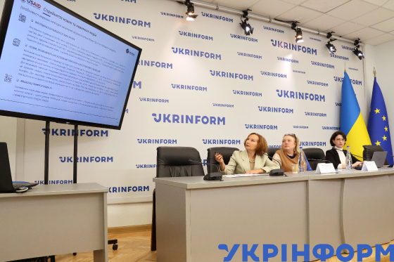 Заступниця директорки Internews Network Оксана Майдан, директорка Internews Network Джилліан МакКормак і модераторка, програмна менеджерка Internews Network Олена Васіна (зліва направо) під час пресконференції на тему: ”Ставлення українців до медіа та споживання різних типів медіа у 2024 році: результати опитування USAID-Internews”, Київ, 7 листопада 2024 року.