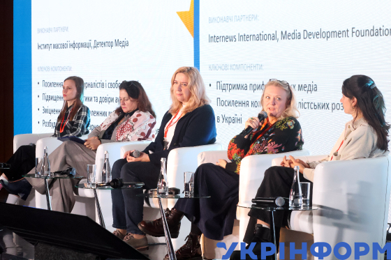 Виконавча директорка "Слідство.Інфо" Анна Бабінець, посол Європейського Союзу в Україні Катаріна Матернова, директорка Інституту масової інформації Оксана Романюк, директорка Internews International в Україні Джилліан Маккормак та регіональна менеджерка RSF з питань України Полін Мофре (зліва направо) беруть участь у Donbas Media Forum 2025, який цьогоріч було присвячено темі "Свобода слова проти свободи брехні - як українські медіа долають глобальні виклики, захищають демократичні цінності та залишаються компасом для суспільства під час війни та світової турбулентності", Київ, 9 жовтня 2025 року.