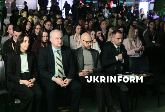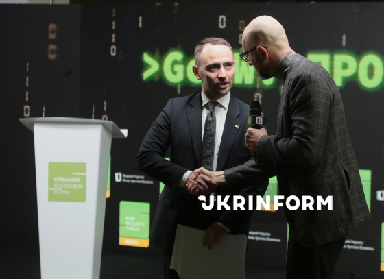 Виконувач обов’язків голови Представництва НАТО в Україні Джозеф Доббс і прем’єр-міністр України (2014-2016 рр.), голова Київського безпекового форуму Арсеній Яценюк (справа наліво) беруть участь в 11-му Київському безпековому форумі для молоді "GEN W²: програмуй майбутнє", Київ, 5 грудня 2025 року.