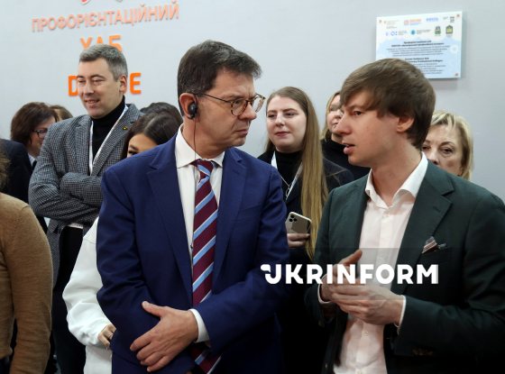 Надзвичайний та Повноважний Посол Швейцарії в Україні Фелікс Бауманн (ліворуч) та заступник міністра освіти і науки України Дмитро Завгородній беруть участь у відкритті профорієнтаційного хабу, створеного на базі Броварського професійного коледжу в межах реалізації швейцарсько-українського проєкту DECIDE у партнерстві з Міністерством освіти і науки України, де школярі можуть спробувати себе у різних професіях, Бровари, Київська область, 4 грудня 2025 року.