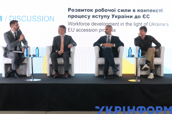Заступник міністра освіти і науки України з питань цифрового розвитку, цифрових трансформацій і цифровізації Дмитро Завгородній, радник з питань розвитку посольства Польщі Артур Гроссман, заступник глави дипломатичної місії Естонії в Україні Вагур Соосаар і модератор (справа наліво) під час щорічної конференції Skills4Recovery "Розвиток робочої сили на шляху України до ЄС", Київ, 5 вересня 2025 року.