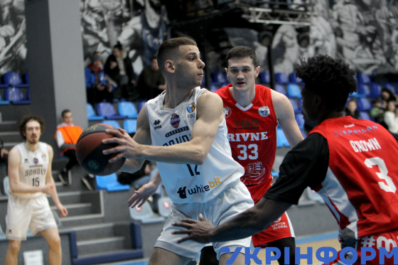 Гравець БК "Харківські Соколи" Гравець Дмитро Мартинов (праворуч) бере участь у матчі чемпіонату України з баскетболу серед команд Суперліги проти БК "Дніпро", що завершився перемогою господарів з рахунком 98:58, у залі СК "Шинник", Дніпро, 28 лютого 2026 року. Гру розпочали ще 1 лютого, але через повітряну тривогу матч було зупинено за 7:47 до кінця другої чверті за рахунку 35:11 на користь дніпрян.