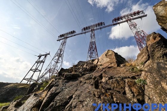 Кам’яні пороги на річці Дніпро на тлі електроопор поруч із дамбою Дніпровської ГЕС, Запоріжжя, 30 жовтня 2024 року.