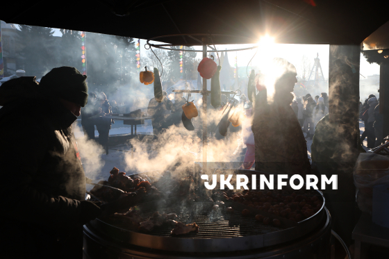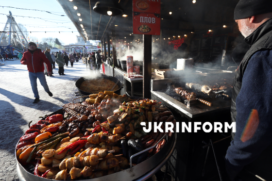 Кухар готує на вогні м`ясо та овочі на різдвяній локації “Зимова країна”, розміщеній на території Національного комплексу “Експоцентр України” (ВДНГ), Київ, 1 січня 2026 року.