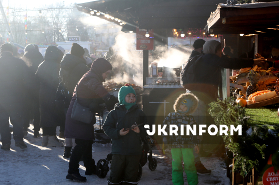 Кияни їдять гарячі страви на різдвяній локації “Зимова країна”, розміщеній на території Національного комплексу “Експоцентр України” (ВДНГ), Київ, 1 січня 2026 року.