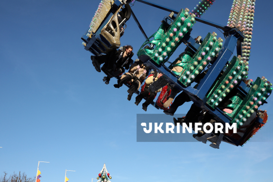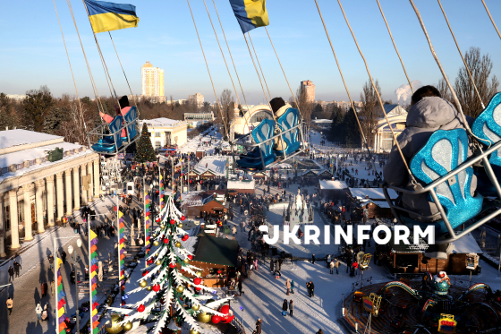 Кияни катаються на атракціоні на різдвяній локації “Зимова країна”, розміщеній на території Національного комплексу “Експоцентр України” (ВДНГ), Київ, 1 січня 2026 року.