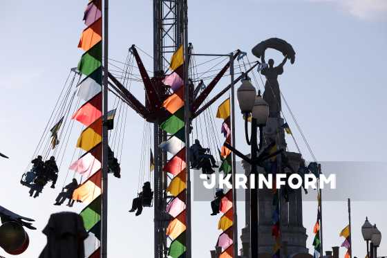 Кияни катаються на ланцюговій каруселі на різдвяній локації “Зимова країна”, розміщеній на території Національного комплексу “Експоцентр України” (ВДНГ), Київ, 1 січня 2026 року.