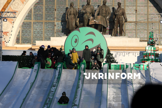 Діти з`їжджають зі гірок на різдвяній локації “Зимова країна”, розміщеній на території Національного комплексу “Експоцентр України” (ВДНГ), Київ, 1 січня 2026 року.