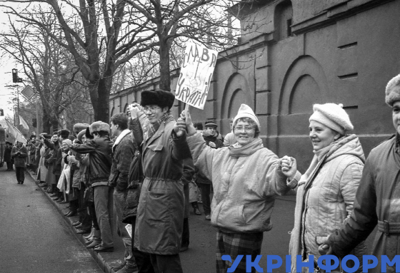 Прихильники української незалежності в день 71-ї річниці проголошення Акта Злуки Української Народної Республіки (УНР) і Західноукраїнської Народної Республіки (ЗУНР) створили "живий ланцюг" на вулиці міста, Львів, 21 січня 1990 року. Фото Володимира Песляка.