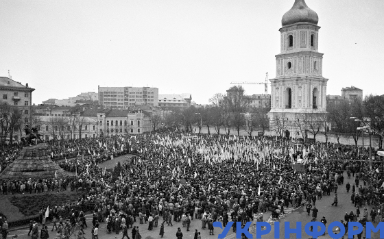Учасники мітингу з нагоди 71-ї річниці проголошення Акта Злуки Української Народної Республіки (УНР) і Західноукраїнської Народної Республіки (ЗУНР) на площі Богдана Хмельницького (нині Софійська), Київ, 21 січня 1990 року. Фото Анатолія Колесника.