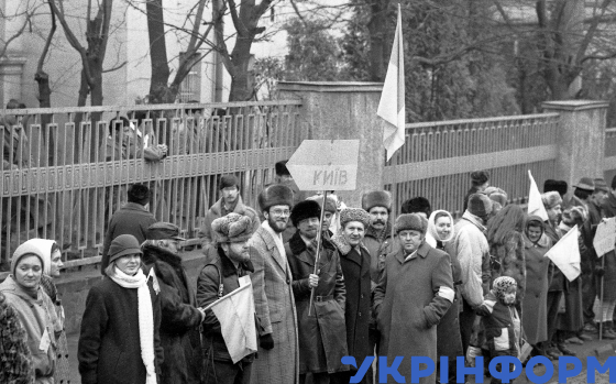 Учасники акції з нагоди 71-ї річниці проголошення Акта Злуки Української Народної Республіки (УНР) і Західноукраїнської Народної Республіки (ЗУНР) створили "живий ланцюг" на вулиці міста, Львів, 21 січня 1990 року. Фото Володимира Песляка.