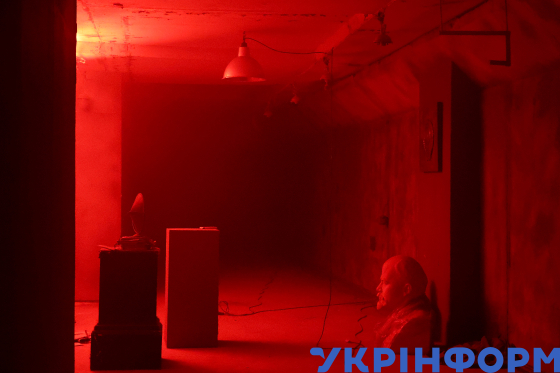 Акторка Марина Кошкіна (третя ліворуч) та сценарист Ярослав Войцешек (третій праворуч) біля погруддя Володимира Леніна під час зйомок фільму "Каховський об’єкт", Київ, 10 березня 2025 року.