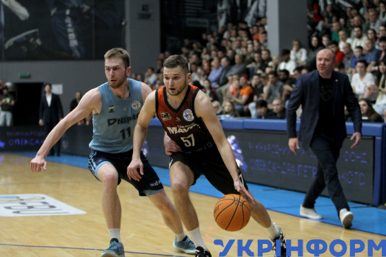 Гравці БК "Черкаські Мавпи" Кирило Марченко (праворуч) та БК "Київ-Баскет" Михайло Бублик беруть участь у матчі чемпіонату України з баскетболу серед команд Суперліги, що завершився поразкою господарів з рахунком 67:93, на майданчику КСК "Шинник", Дніпро, 10 січня 2026 року.