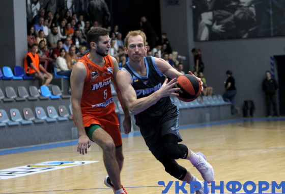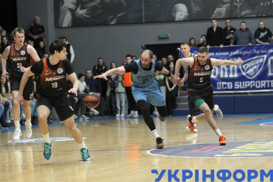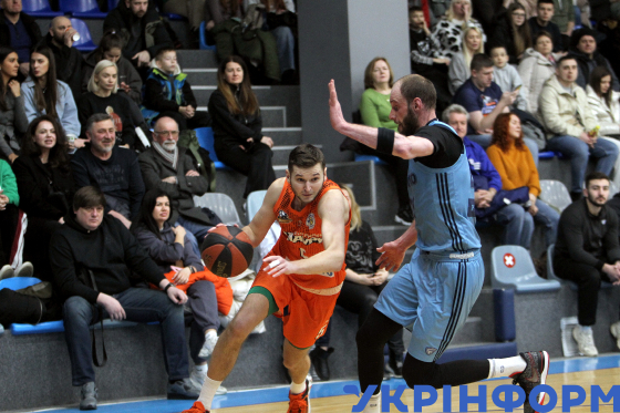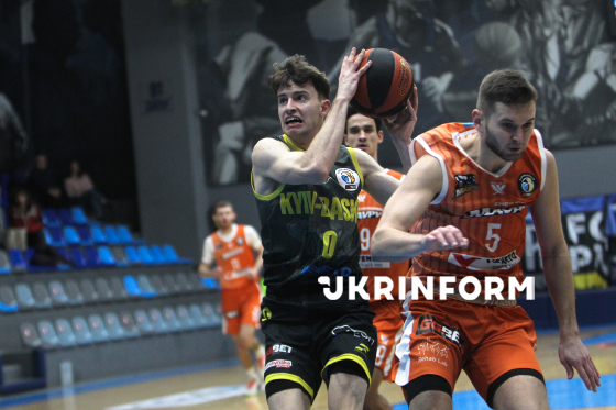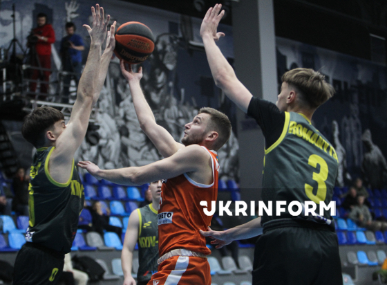 Гравець БК "Черкаські Мавпи" Кирило Марченко (у центрі) бере участь у матчі чемпіонату України з баскетболу серед команд Суперліги проти БК "Київ-Баскет", що завершився поразкою господарів з рахунком 67:93, на майданчику КСК "Шинник", Дніпро, 10 січня 2026 року.