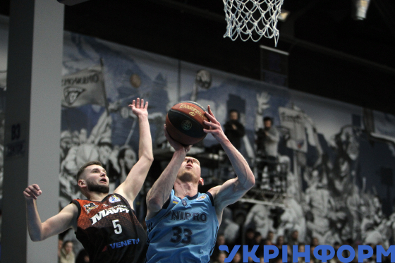 Гравець БК “Черкаські Мавпи” Кирило Марченко, гравець БК “Дніпро” Максим Закурдаєв (зліва направо) борються за м`яч під час першого матчу 1/4 фіналу чемпіонату України з баскетболу серед команд Суперліги між БК “Дніпро” і БК “Черкаські Мавпи”, що завершився з рахунком 93:62 на користь дніпровської команди, у СК “Шинник”, Дніпро, 4 квітня 2026 року.