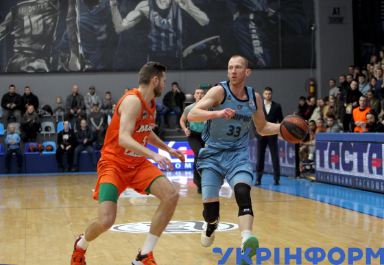 Гравці БК "Дніпро" Іван Колдомасов (праворуч) та БК "Черкаські Мавпи" Кирило Марченко беруть участь у матчі чемпіонату України з баскетболу серед команд Суперліги, що завершився перемогою господарів з рахунком 101:70, у залі СК "Шинник", Дніпро, 31 січня 2026 року.