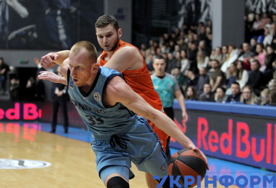 Гравці БК "Дніпро" Максим Закурдаєв (ліворуч) та БК "Черкаські мавпи" Кирило Марченко під час півфінального матчу Кубка України з баскетболу серед команд Суперліги, що завершився перемогою господарів майданчика з рахунком 87:58, Дніпро, 2 березня 2025 року.