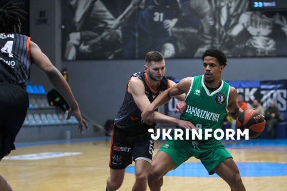 Гравці БК "Запоріжжя" Брекстон Лі Ловінгс (праворуч) та БК "Черкаські Мавпи" Кирило Марченко борються за м’яч під час матчу 11-го туру регулярного чемпіонату Суперліги GGBET, який було перервано через повітряну тривогу за рахунку 67:58 на користь черкаської команди, Дніпро, 1 лютого 2026 року.