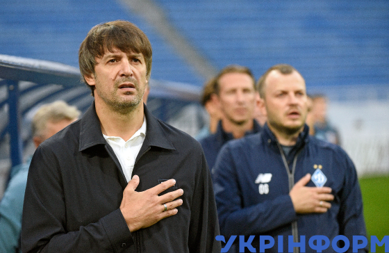 Головний тренер київського ФК "Динамо" Олександр Шовковський (ліворуч) під час виконання Гімну України перед початком матчу 4-го туру Української Прем’єр-ліги проти полтавського ФК "Ворскла", що завершився з рахунком 3:1 на користь його команди, Київ, 18 вересня 2024 року.