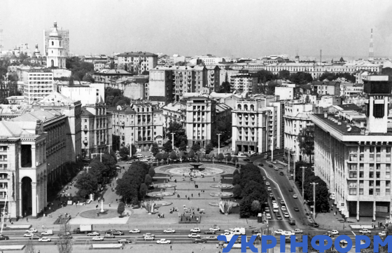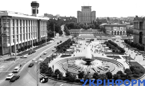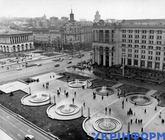 Будівля Головпоштамту (праворуч) та фонтани на площі Жовтневої революції (нині Майдан Незалежності), Київ, 1981 рік. Фото Анатолія Піддубного.