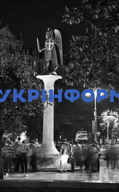 Скульптура небесного покровителя Києва архістратига Михаїла (автор Георгій Куровський) на вечірньому Майдані Незалежності, Київ, 1996 рік. Фото Володимира Фаліна.