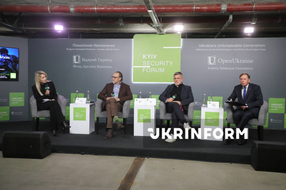Старший науковий співробітник Атлантичної ради Клара Калудерович, колишній старший співробітник Центрального розвідувального управління США Ральф Ф. Гофф, колишній старший співробітник Центрального розвідувального управління США Гленн Корн та командувач Центрального командування США (2008-2010), директор ЦРУ (2011-2012) та член Ради безпеки Київського безпекового форуму (КБФ), генерал Девід Петреус (зліва направо) беруть участь у дискусії на тему: "Що насправді бачить Вашингтон, дивлячись на Україну" в межах спеціального заходу "Українське покоління Незламних", що відбувся за ініціативи генерала Девіда Петреуса, а також за підтримки КБФ, Київ, 3 квітня 2026 року.