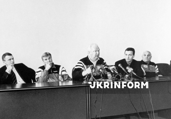 Головний тренер київського "Динамо" Валерій Лобановський (у центрі) на зустрічі з представниками ЗМІ на спортивній базі київських динамівців у Конча-Заспі, Київ, 25 березня 1998 року. Фото Володимира Фаліна.