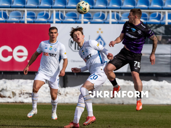 Захисник ФК “Динамо” (Київ) Костянтин Овчаренко, півзахисник ФК “Динамо” (Київ) Богдан Редушко та захисник ФК “Епіцентр” (Кам`янець-Подільський) Ігор Кирюханцев (зліва направо) під час матчу 18-го туру чемпіонату України з футболу серед команд Прем`єр-ліги між “Динамо” (Київ) і “Епіцентр” (Кам`янець-Подільський), що завершився з рахунком 4:0 на користь динамівців, на стадіоні імені Валерія Лобановського, Київ, 27 лютого 2026 року.