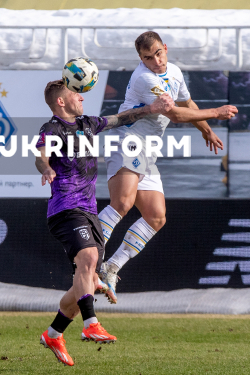 Захисник ФК “Динамо” (Київ) Костянтин Овчаренко та захисник ФК “Епіцентр” (Кам`янець-Подільський) Ігор Кирюханцев борються за м`яч під час матчу 18-го туру чемпіонату України з футболу серед команд Прем`єр-ліги між “Динамо” (Київ) і “Епіцентр” (Кам`янець-Подільський), що завершився з рахунком 4:0 на користь динамівців, на стадіоні імені Валерія Лобановського, Київ, 27 лютого 2026 року.