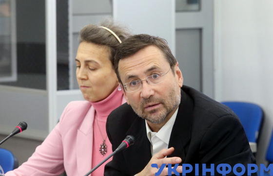 Голова хабу репараційної практики Глобального фонду тих, хто пережили насильство, Крістіан Корреа (праворуч) та старший радник з питань репарацій та перехідного правосуддя МОМ Ігор Цвєтковський під час презентації результатів впровадження пілотного проєкту з надання невідкладних проміжних репарацій постраждалим від сексуального насильства, пов’язаного з конфліктом, в Українському національному інформаційному агентстві "Укрінформ", Київ, 14 листопада 2024 року.
